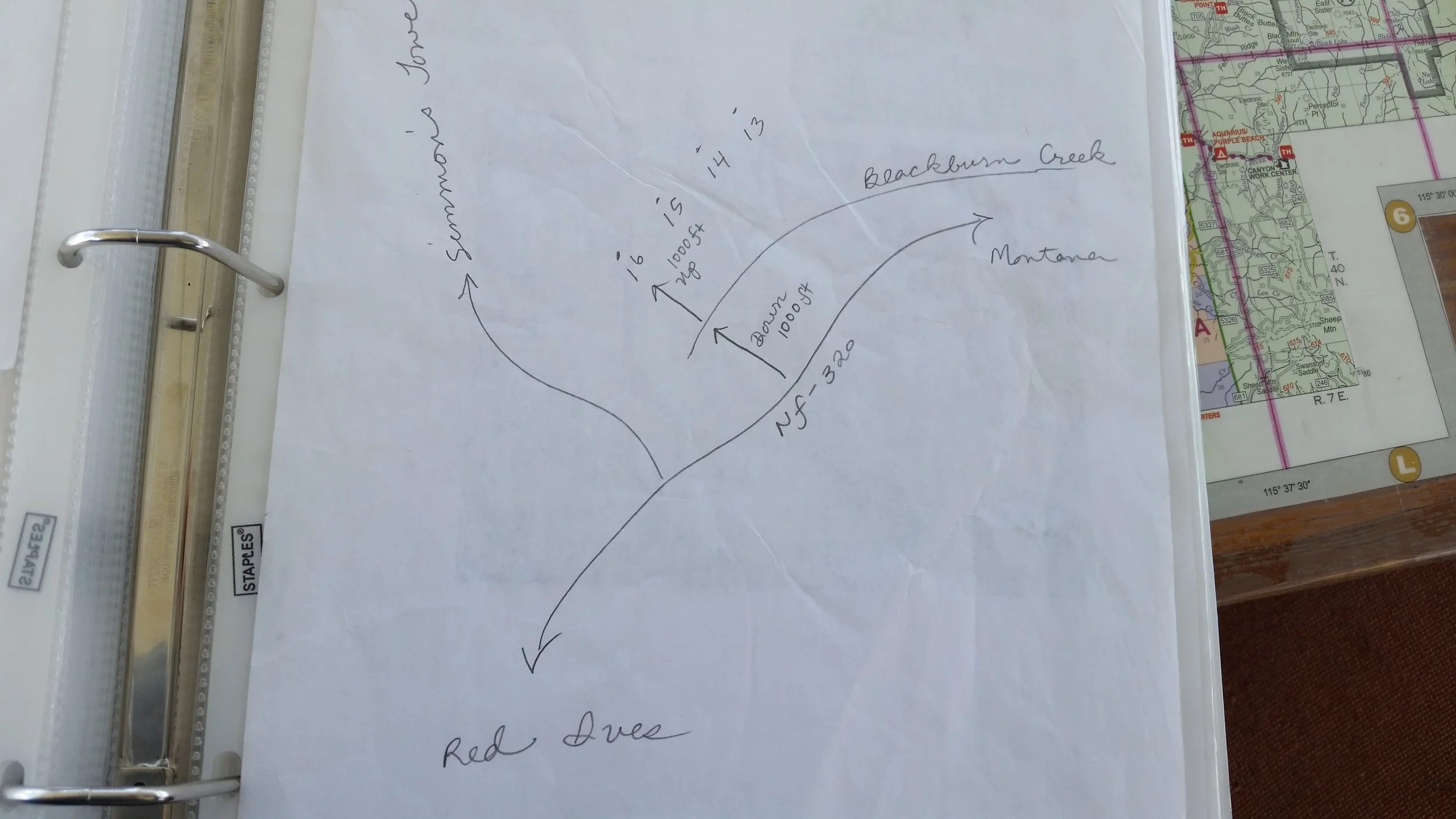 I was given a blank sheet - except for a hand-drawn map with arrows pointing down the road to Montana, then down a thousand feet perpendicular to the road, across a creek, then up a thousand feet to the survey.